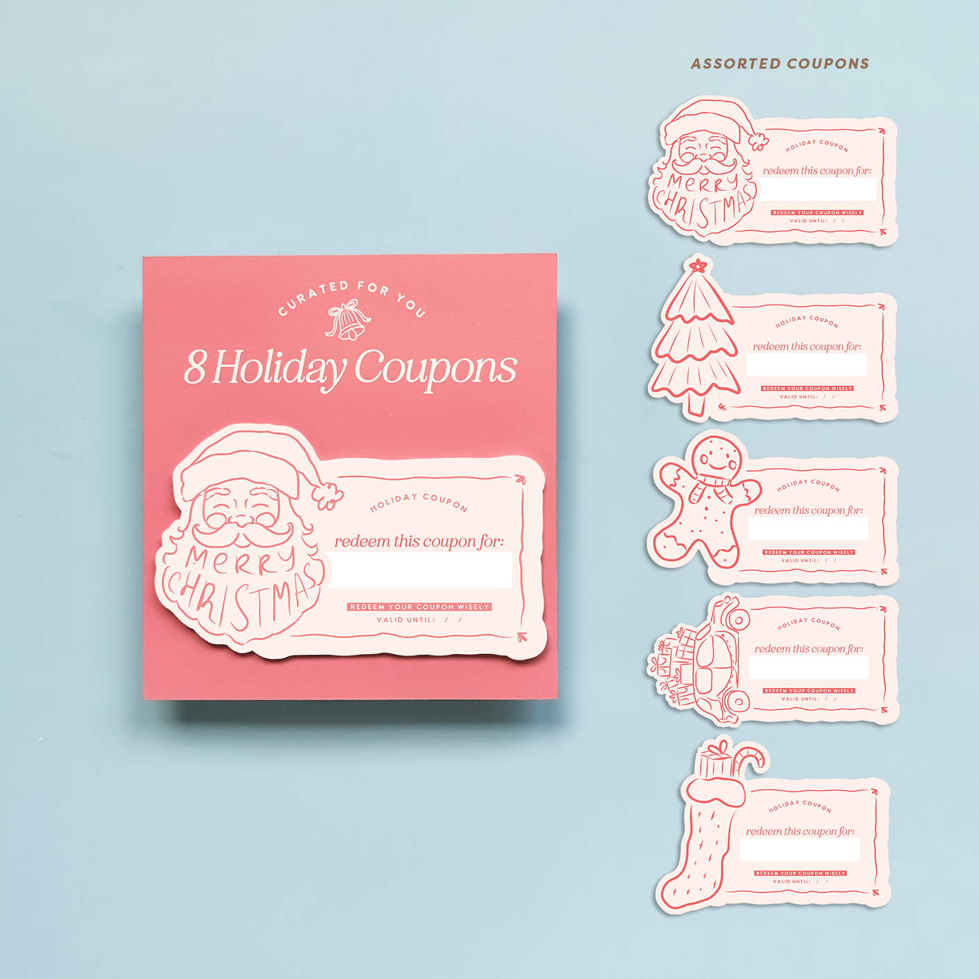 A playful set of blank holiday coupons in festive die-cut shapes! Santa, a stocking, a gingerbread cookie, and more. Each one is ready to be filled in with a custom activity, outing, or treat. Great for stocking stuffers, advent calendars, family traditions, or creative wrapping. Packaged flat in a clear cello bag and ready to display. Includes: • 8 die-cut blank holiday coupons (approx. 4 x 2.5 in) • Retail Packaging: Flat backing card and clear cello bag Great for: • Gift shops, paper goods stores, holiday markets, and kids boutiques • Stocking stuffers, holiday countdowns, advent calendar fillers, festive notes, classroom gifting Holiday Coupon Pack, Blank Christmas Coupons, DIY Holiday Activities, Die-Cut Paper Goods, Stocking Stuffer, Holiday Countdown Ideas, Small Gift Under $20, Made in Canada 430
