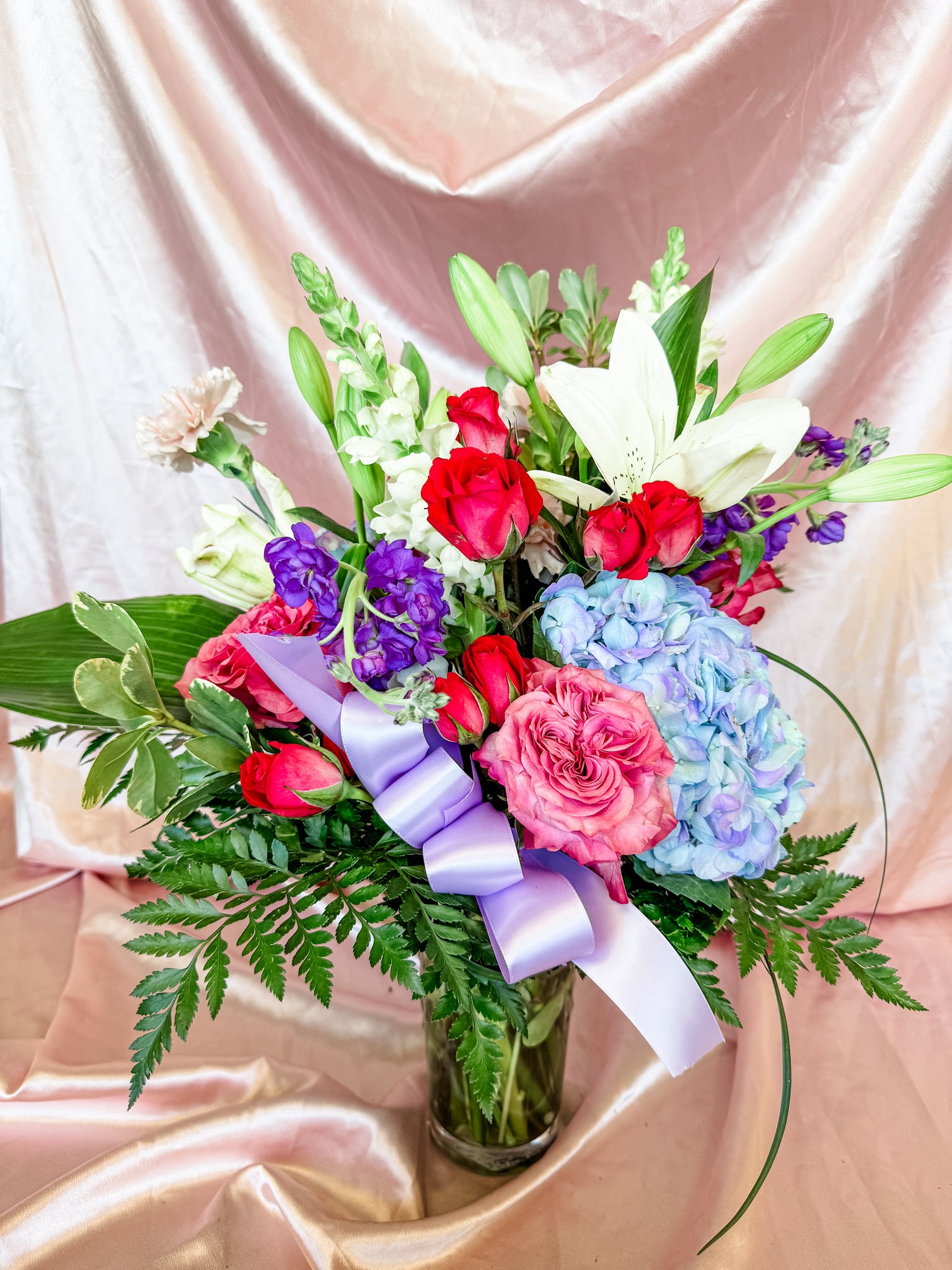 This vibrant and full-bodied arrangement is a stunning celebration of color, texture, and floral variety. Designed with an artful balance of bold hues and soft pastels, it brings a lively yet elegant presence to any setting. At its heart are rich red roses that add passion and warmth, complemented by delicate spray roses that introduce layers of softness and charm. These pair beautifully with the ruffled, garden-style pink blooms that add volume and romantic flair.