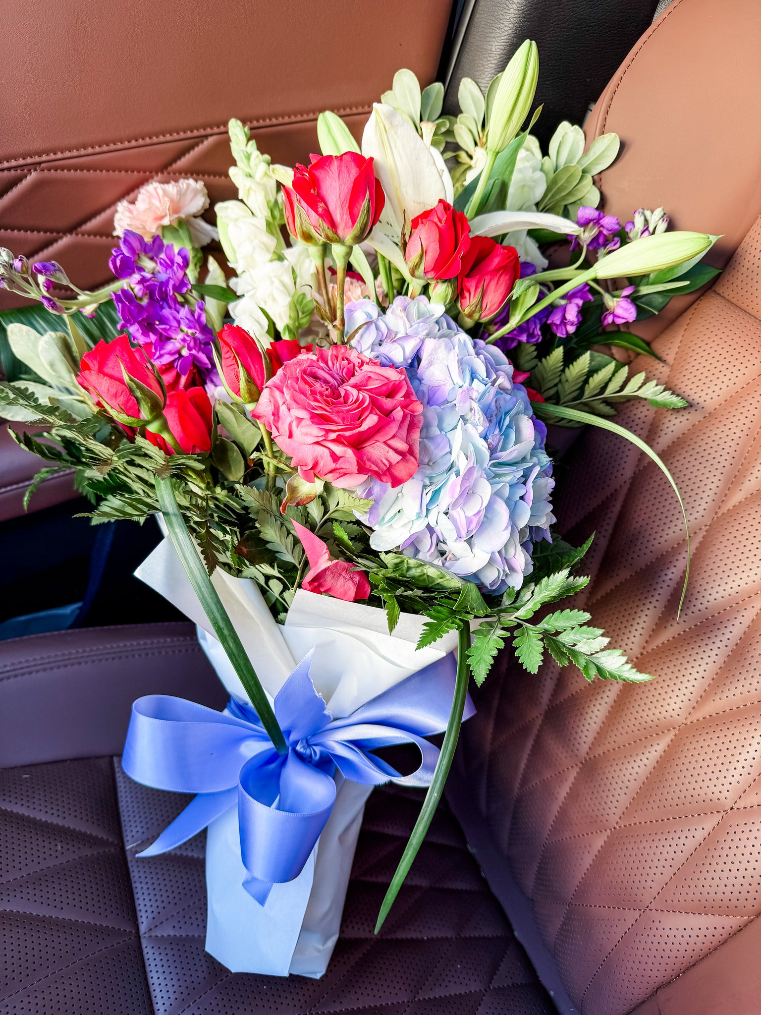 A striking cluster of blue and lavender hydrangeas introduces a cool, dreamy contrast, enhancing the arrangement’s depth and giving it a lush, luxurious feel. Tall stems of snapdragons and stock flowers offer height and structure, drawing the eye upward with their soft white and pastel tones. Large white lilies add a touch of classic beauty, their open petals creating a graceful, star-like focal point amidst the vibrant colors.